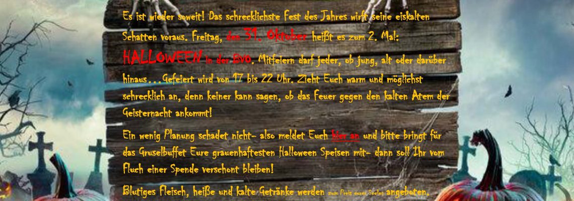 Es ist wieder soweit! Das schrecklichste Fest des Jahres wirft seine eiskalten Schatten voraus. Freitag, den 31. Oktober heißt es zum zweiten Mal: HALLOWEEN in der BVO. Mitfeiern darf jeder, ob jung, alt oder darüber hinaus…Gefeiert wird von 17 bis 22 Uhr. Zieht Euch warm und möglichst schrecklich an, denn keiner kann sagen, ob das Feuer gegen den kalten Atem der Geisternacht ankommt!